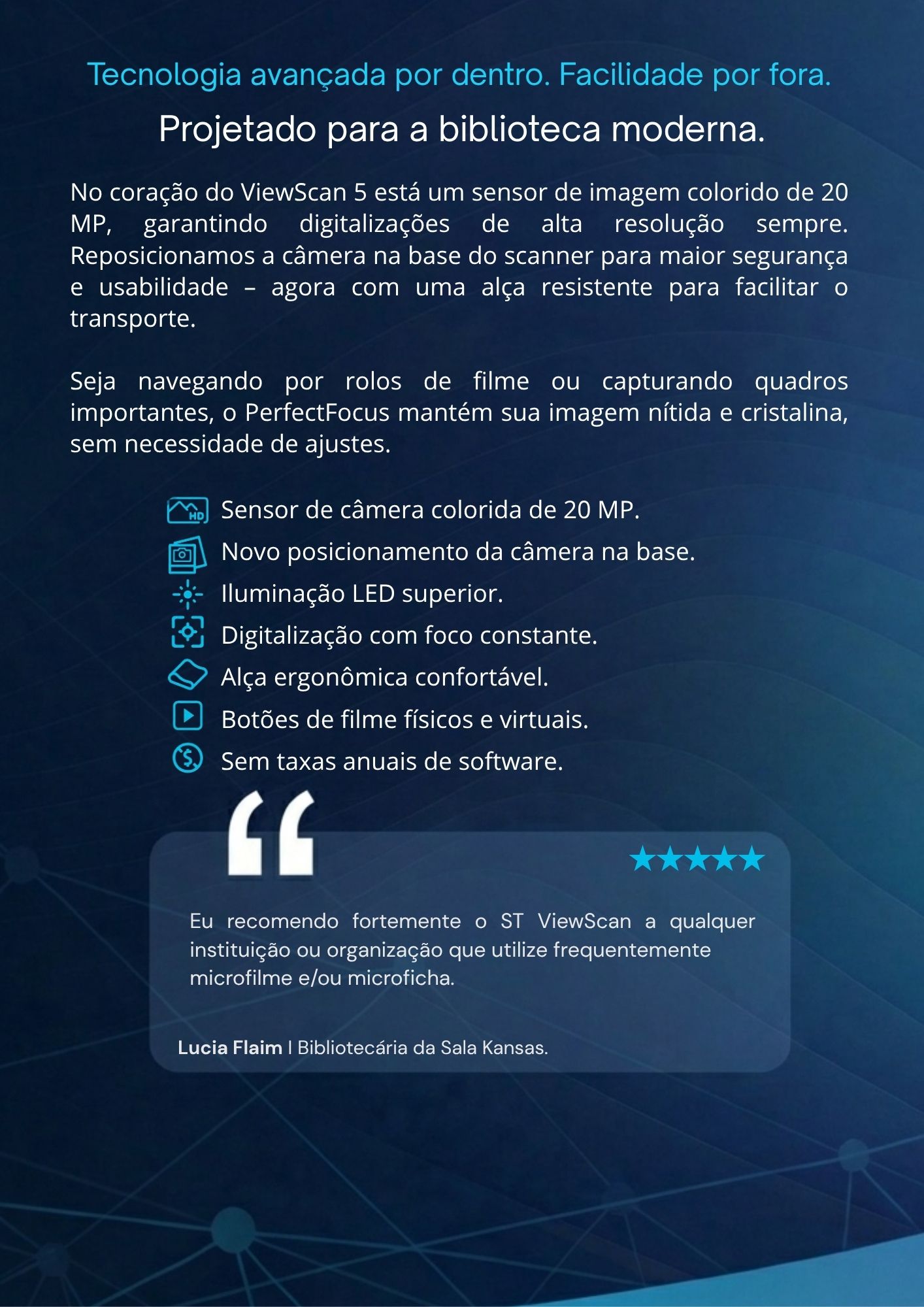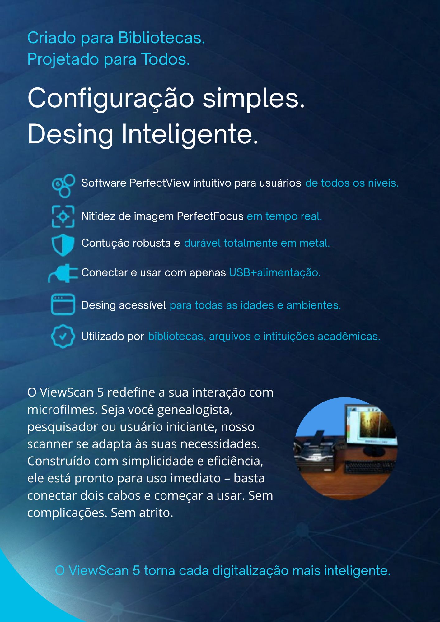 Com instalação simples (plug & play), estrutura robusta em metal e compatibilidade com diversos formatos de microformas, como microfilme e microficha, o ViewScan 5 é a solução ideal para quem busca modernizar processos, preservar documentos e facilitar o acesso à informação.